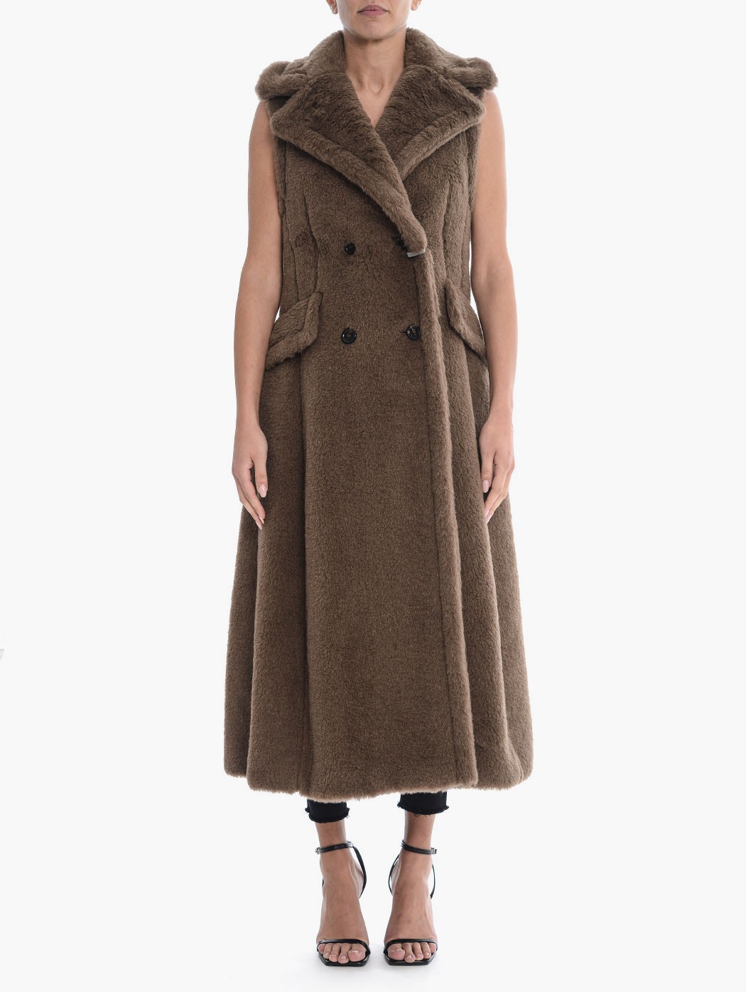 Gilet lungo doppiopetto Max Mara in alpaca e lana con collo a revers, tasche frontali con patta e chiusura frontale con bottoni. La modella indossa una taglia 38. Composizione: 62% alpaca, 26% lana vergine, 12% seta.