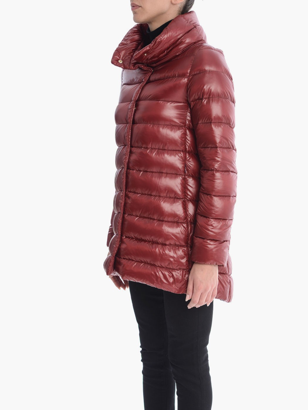 Piumino foderato Herno ‘Amelia’ in nylon con collo alto a cratere, trattamento idrorepellente, tasche laterali con zip, logo metallico sul retro e chiusura frontale con bottoni. La modella indossa una taglia 38. Composizione: 100% poliammide; fodera 100% poliammide; imbottitura 90% piumino, 10% piuma.