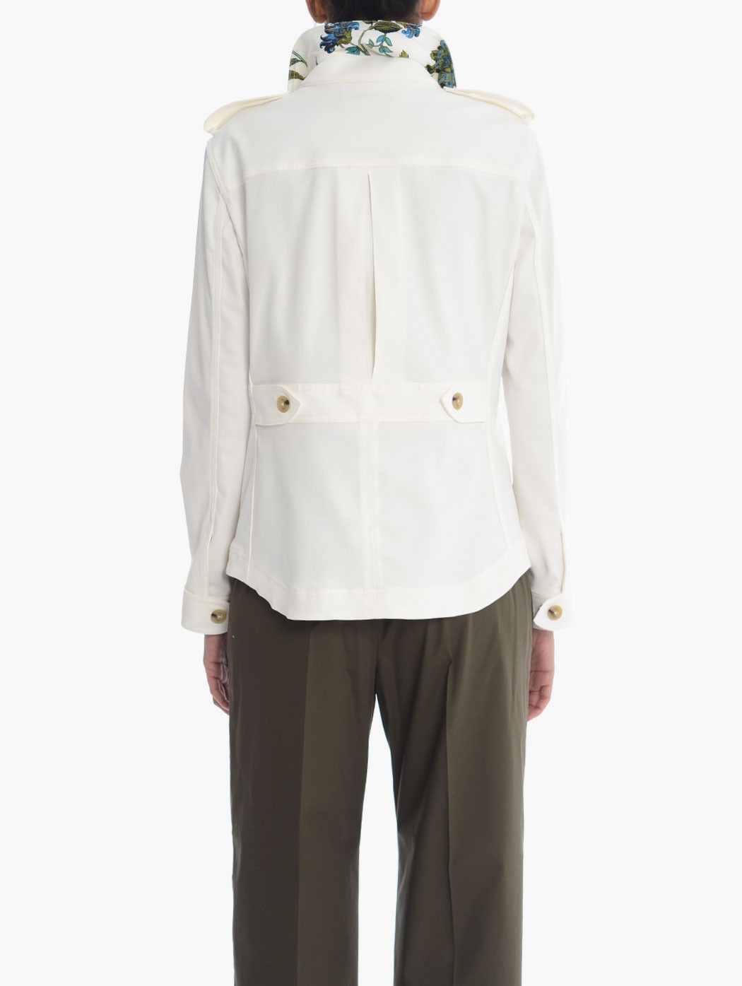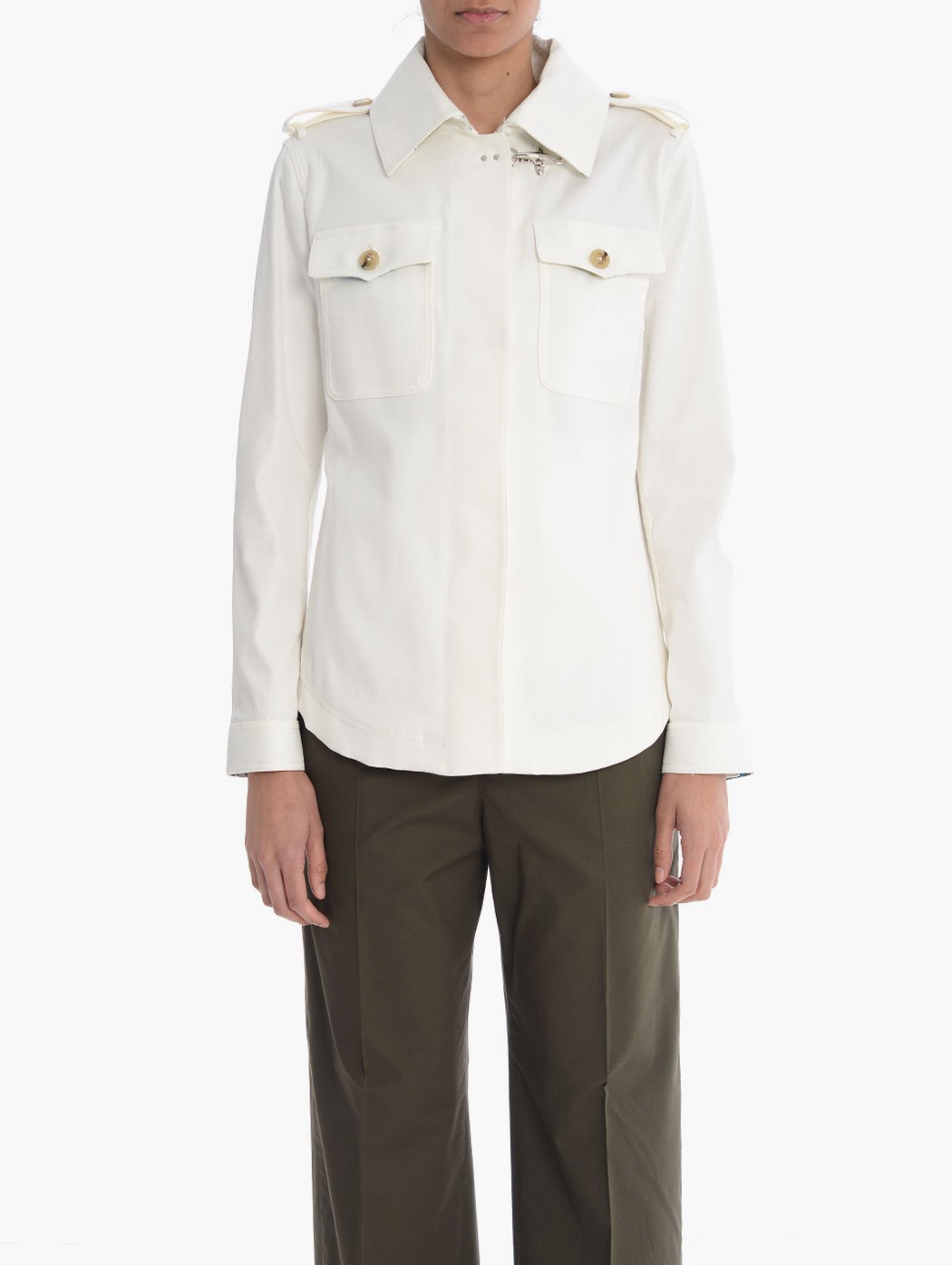 Giacca Fay in drill di cotone con trattamento anti-goccia con colletto a camicia, tasche sul petto con patta e bottone, alamari con bottoni su spalle e retro, polsi con bottoni e chiusura frontale con bottoni e classico gancio Fay. La modella indossa una taglia XS. Composizione: 98% cotone, 2% elastan. Made in Italy.