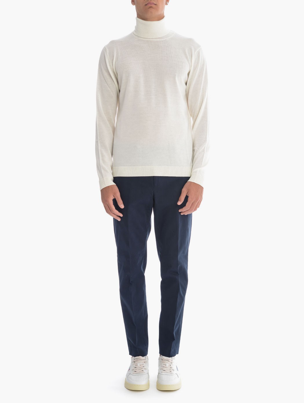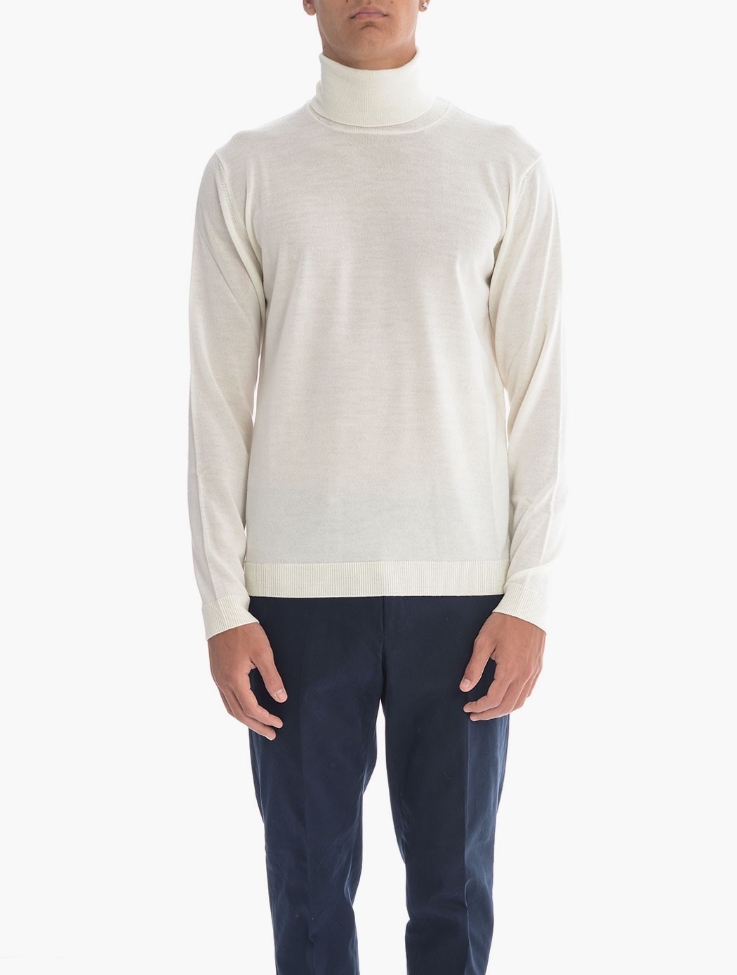 Dolcevita Roberto Collina in lana merino con collo, polsini e fondo a costine. Il modello indossa una taglia 50. Composizione: 100% lana merino. Made in Italy.