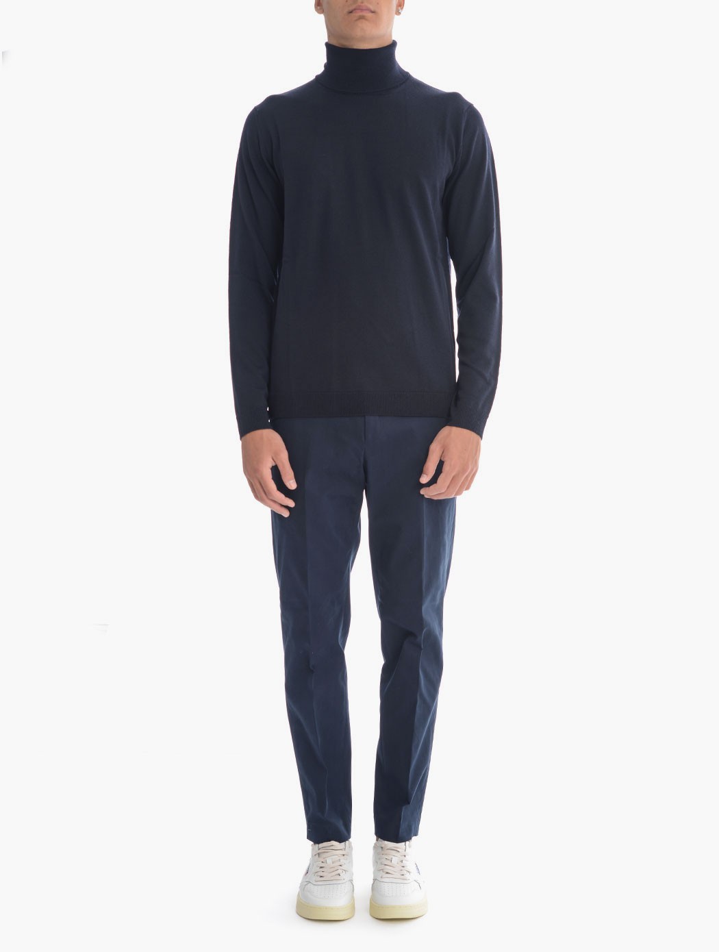 Dolcevita Roberto Collina in lana merino con collo, polsini e fondo a costine. Il modello indossa una taglia 50. Composizione: 100% lana merino. Made in Italy.
